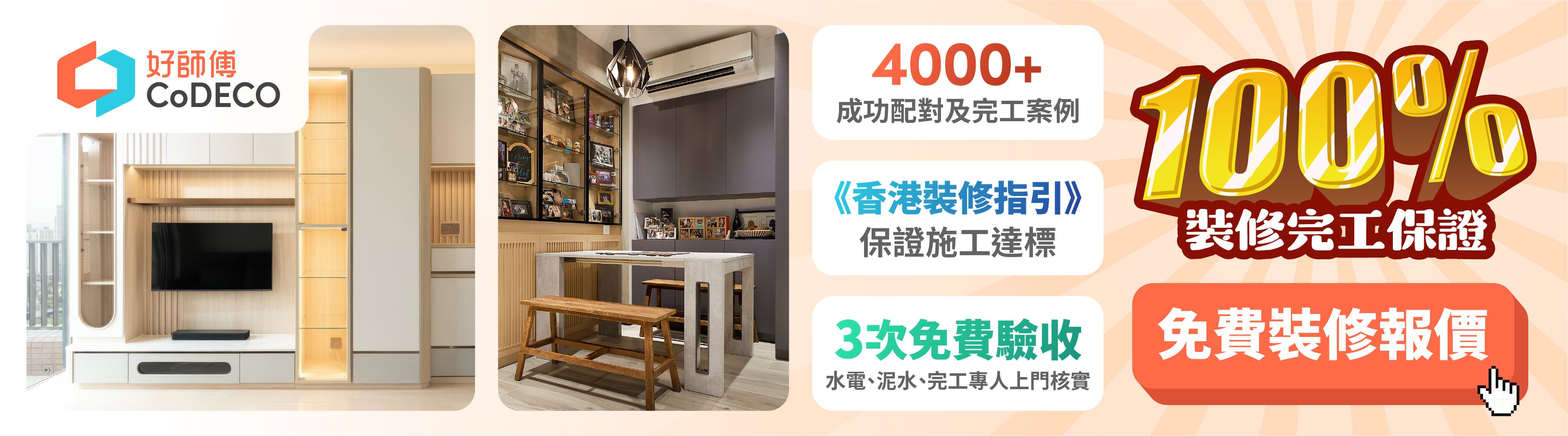 家居裝修一生人可能只有幾次,想順利揀到心水師傅同裝修風格,同時又可以慳錢、慳時間?好師傅CoDECO擁有經嚴格審查嘅裝修師傅網絡,可以透過顧問團隊揀選合適嘅師傅之外,所有裝修物料、費用、工時都一目了然,絕無隱藏條款。立即上CoDECO獲取免費網上報價!