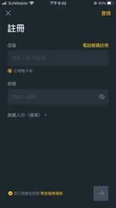可以選擇以電郵信箱或手機電話註冊帳戶,然後輸入帳號密碼及推薦人ID(如有)。