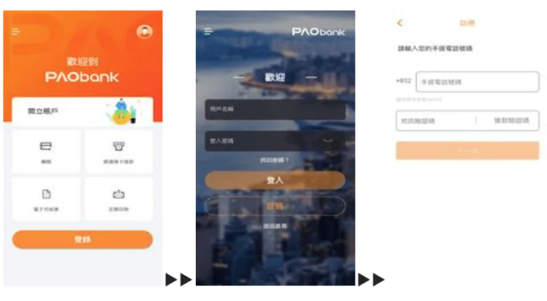 進入PAOBank App,PAOBank會要求申請人先細閱條款及細則後,同意後介面會簡介PAOBank的特色,按「立即開戶」。進入主頁面入,按「開立賬戶」,再按「註冊」,並輸入手機號碼以獲得驗證碼並進行驗證。
