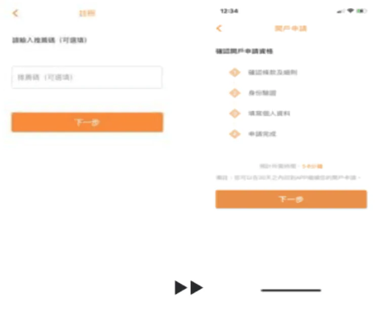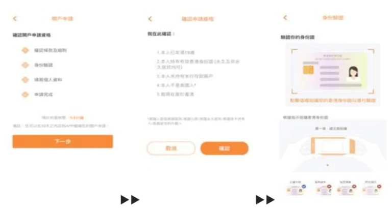 系統會簡介接下來的開戶程序,並列出開戶要求。申請人同意條款及細則後,需按要求以3張不同角度拍攝身份人以作驗證。完成拍攝後,系統會要求申請人核對身份證資料以作確認。