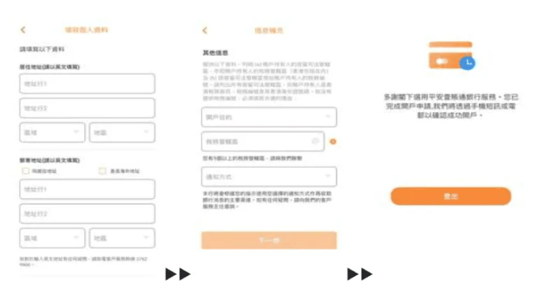 按指示填寫居住地址、職業等個人資料,完成後選擇開戶目的及稅務管轄區,完成後等待PAOBank透過手機或電郵確認成功開戶。