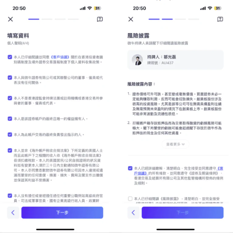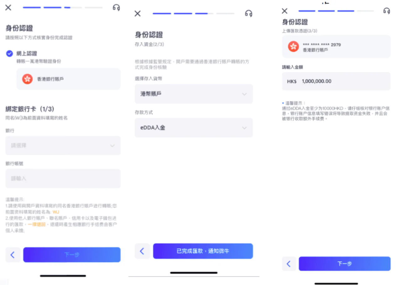 選擇網上認證的話,需要轉賬HK$10,000到微牛證券,若選擇面對面認證,則需預約並攜帶身份證明文件至微牛證券開戶。上傳身份證照片及最近三個月的地址證明,然後綁定同名香港銀行賬戶,然後使用該賬戶轉賬不少於HK$10,000到微牛證券指定賬戶,上傳匯款憑證(包含匯款金額、匯款帳號和匯款編號)通知微牛。若使用FPS轉數快,最快可於數分鐘內到賬。