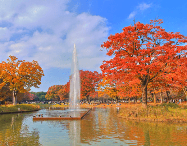 東京賞楓勝地代代木公園前身是東京奧運選手村,現已成為市中心的大型森林公園。園內佔地極廣,設有廣場、噴泉、長櫈、單車步道等,還不時舉辦跳蚤市場,吸引當地年輕人前來散步、野餐。每年秋天紅葉季,公園超過1,300棟樹開始變色,楓樹和銀杏樹交織出秋意洋溢的紅黃色,成為東京紅葉季的絕美景象。