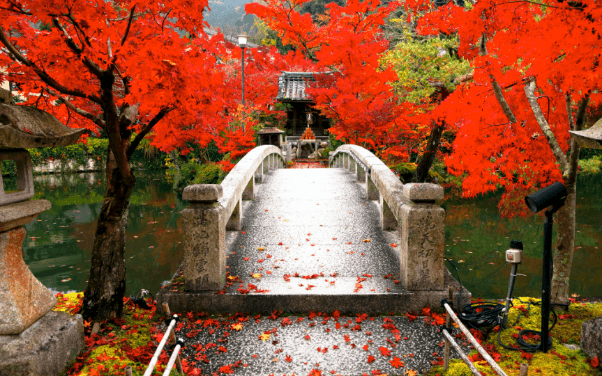 日本紅葉名所永觀堂禪林寺佔地廣闊,園內植有3,000棵楓樹,楓樹的姿態和顏色各異,交疊出獨特的紅葉美景,如登上寺內最高的多寶塔,還可將漫天紅葉的景致盡收眼底。另外,永觀堂禪林寺亦是著名的夜間賞楓地點,入夜亮燈後,池塘倒映著紅葉同小橋,又是別樣的美。