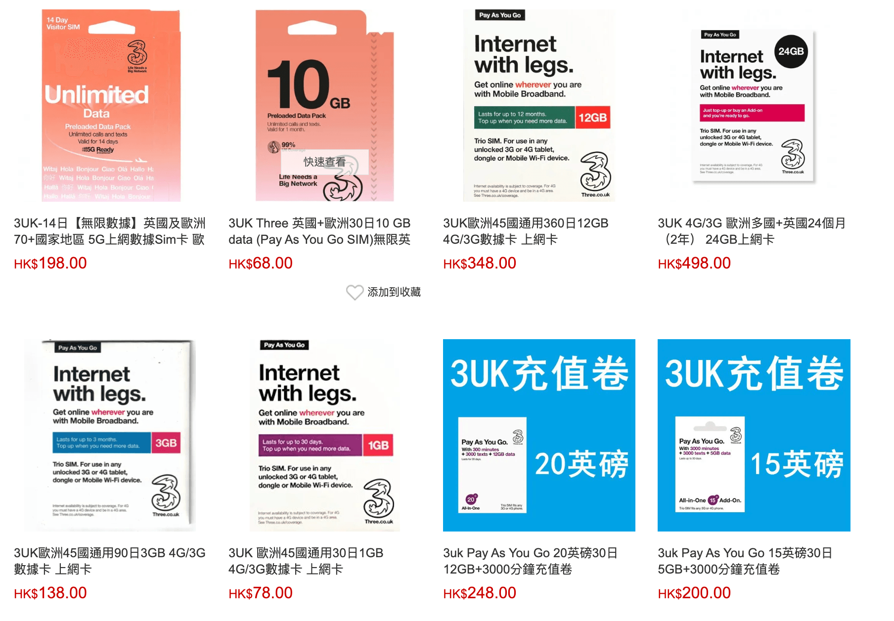 是由英國的3(Three)所推出的全球多國漫遊卡,使用地區以英國為主,在其他國家就是「漫游模式」,會自動連結當地訊號。除了以上比較多人選擇的30日 10GB、24個月24GB、無限GB方案,還有許多數據組合供選購,其中一個方案名為Pay As You Go,供買家自定儲值額。