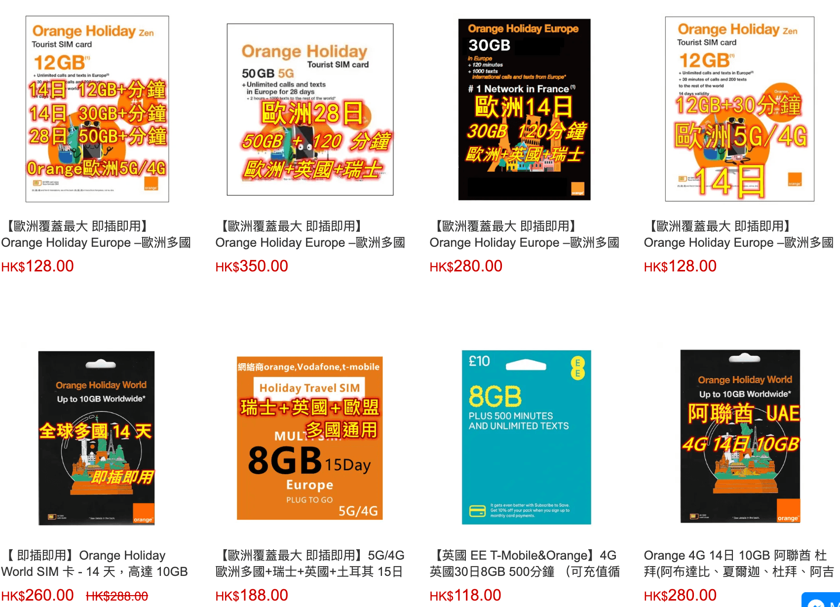 | Orange Holiday | 7至90日不等,1/4/12/30/100/500GB(方案甚多,恕未能盡錄 | 歐洲40+國家 |