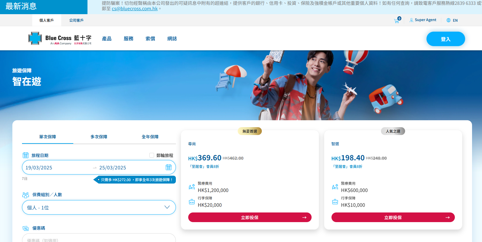 Blue Cross藍十字智在遊旅遊保險提供三種靈活保障計劃,包括單次旅程、多次旅程及全年保障,滿足不同旅客的需求。其保險範圍廣泛,確保旅客在不同情況下都能獲得周全保障。