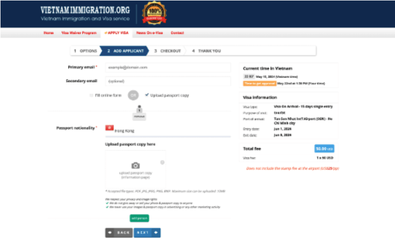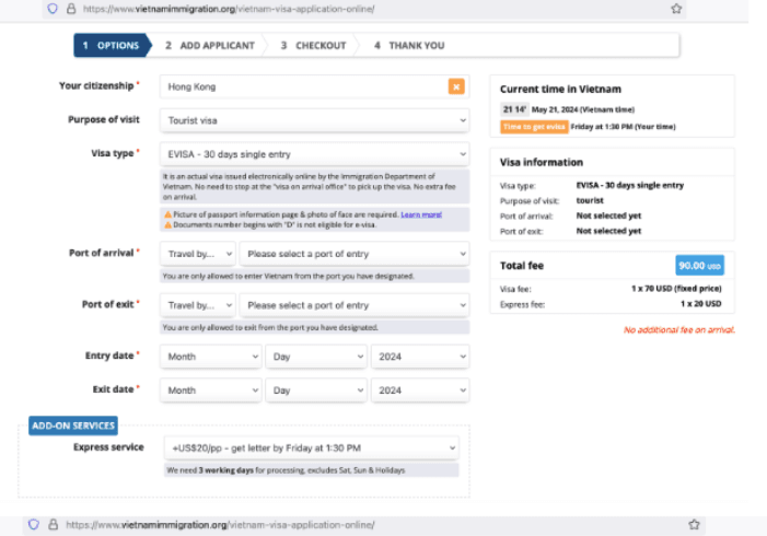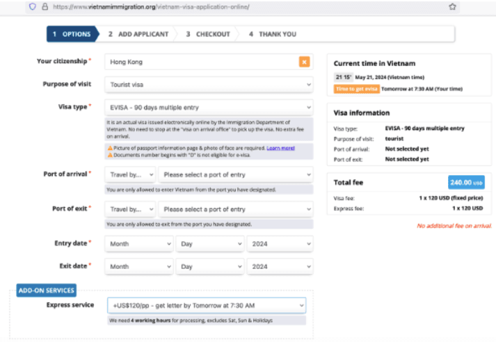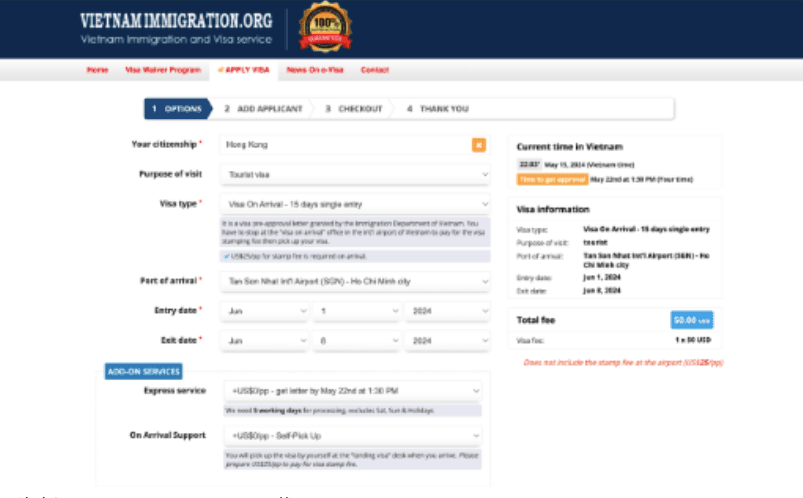 前往中介網站(以vietnamimmigration.org為例),首先選取護照、簽證類別(選擇Visa On Arrival)、出入境日期及機場或港口,如有需要可加選特快審批。