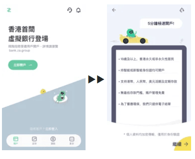 下載及開啟 ZA Bank App 就會見到兩隻「吉祥物」,行可愛活潑路線,介面簡潔,無多餘功能,按「立即開戶」,便會進入開戶程序。