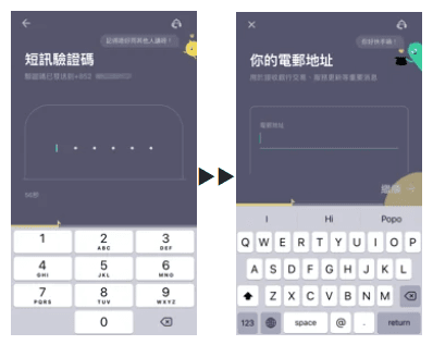 輸入手機號碼會即時收到短訊驗證碼,成功驗證後填電郵地址,供接收ZA Bank月結單之用。