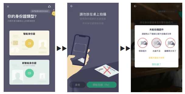 接下來進行身份驗證,由於虛擬銀行沒有分行,所以一切都在App/網上完成。先依照手上的智能身份證版本選擇新或舊智能身份證。