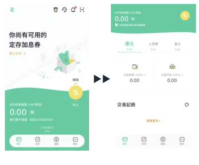 ZA Bank App 主介面十分簡潔,底部最左邊的「賬戶」就是主頁,顯示存款總額,在綠色位置向上掃,就可以看到最近的交易紀錄以及三種貨幣現時的定存額等。