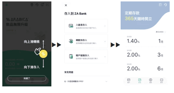 銀行提供的3個過數方法,均可即時入數,「入錢易存入」即綁定其他銀行戶口,授權ZA Bank從你的其他銀行戶口直接過數,「轉數快」及「賬戶號碼存入」即我們平日說的戶口過數,但ATM櫃員機入數暫時未支援,存錢之後就可以開始做定期了。