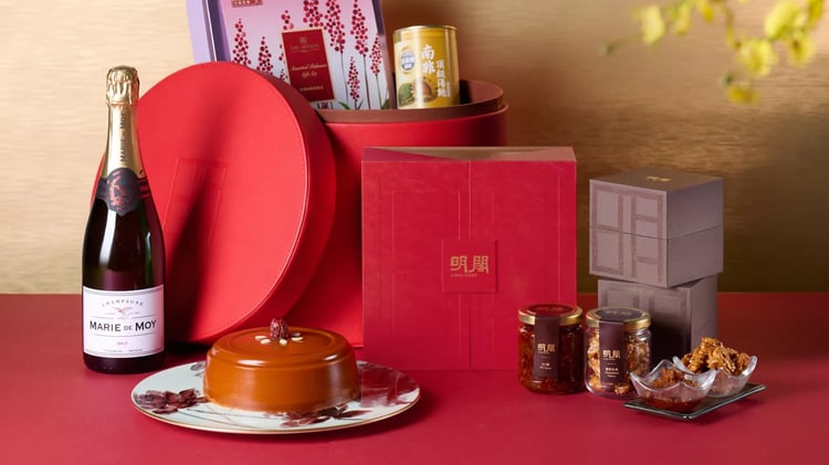 明閣同時推出全新的精美賀歲禮籃,內有賀年糕點、明閣自家製XO醬、南非頂級湯鮑(12頭)、紅酒等,即日起至2026 年1月31日期間購買,可享早鳥優惠價。
