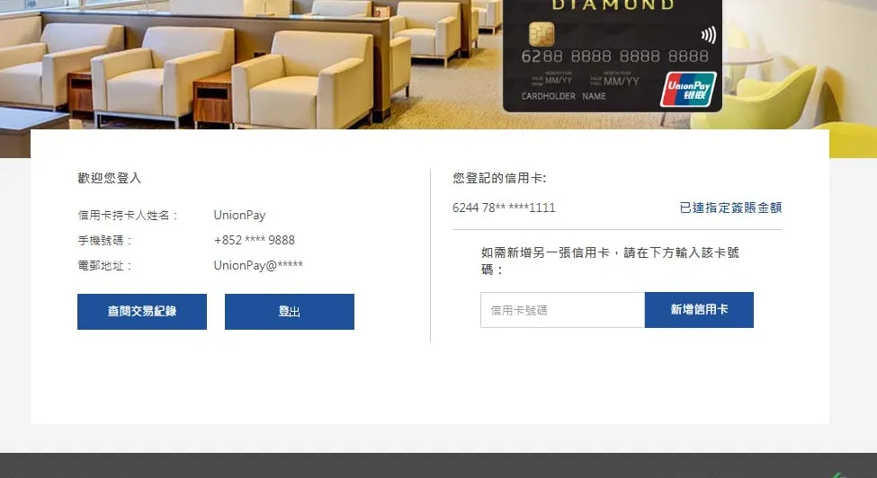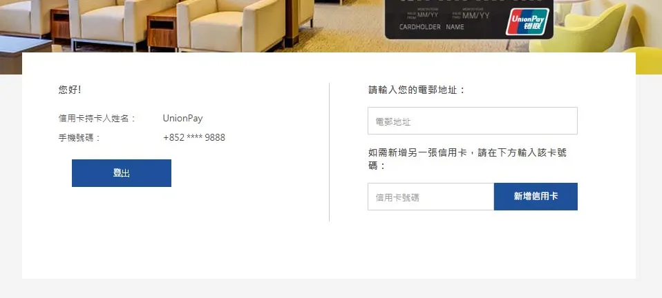 登記銀聯卡號碼及電子郵件地址,電郵將用作接收憑證、審批通知和貴賓室權益通知。