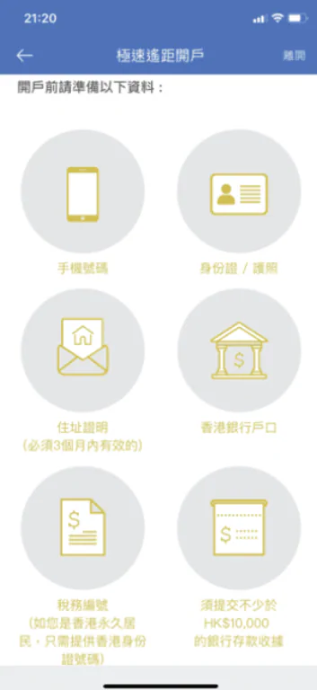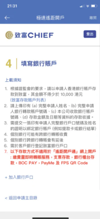 遙距開戶通:透過「致富通」應用程式或致富網頁(需要綁定銀行賬戶存入金額不少於HK$1萬)