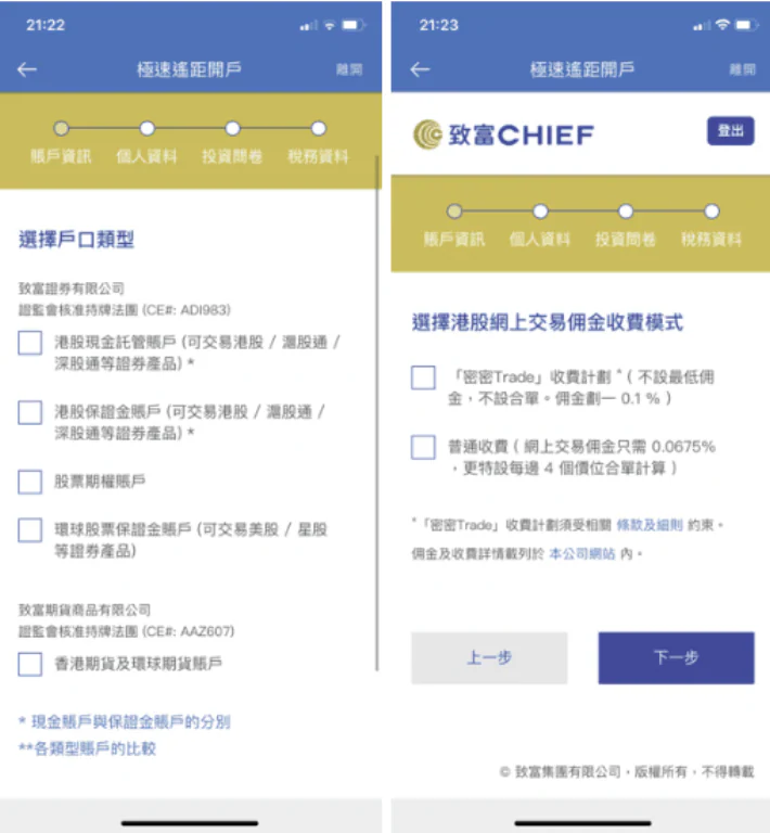 下載「致富通」應用程式,驗證手機號碼和設定密碼後,就可以選擇希望開立的戶口類型,包括港股現金託管賬戶(即普通港股及內地股票交易)、港股保證金賬戶(即孖展交易)、股票期權賬戶及環球股票保證金賬戶(即美股和新加坡股交易),用戶可根據個人投資需要選擇。