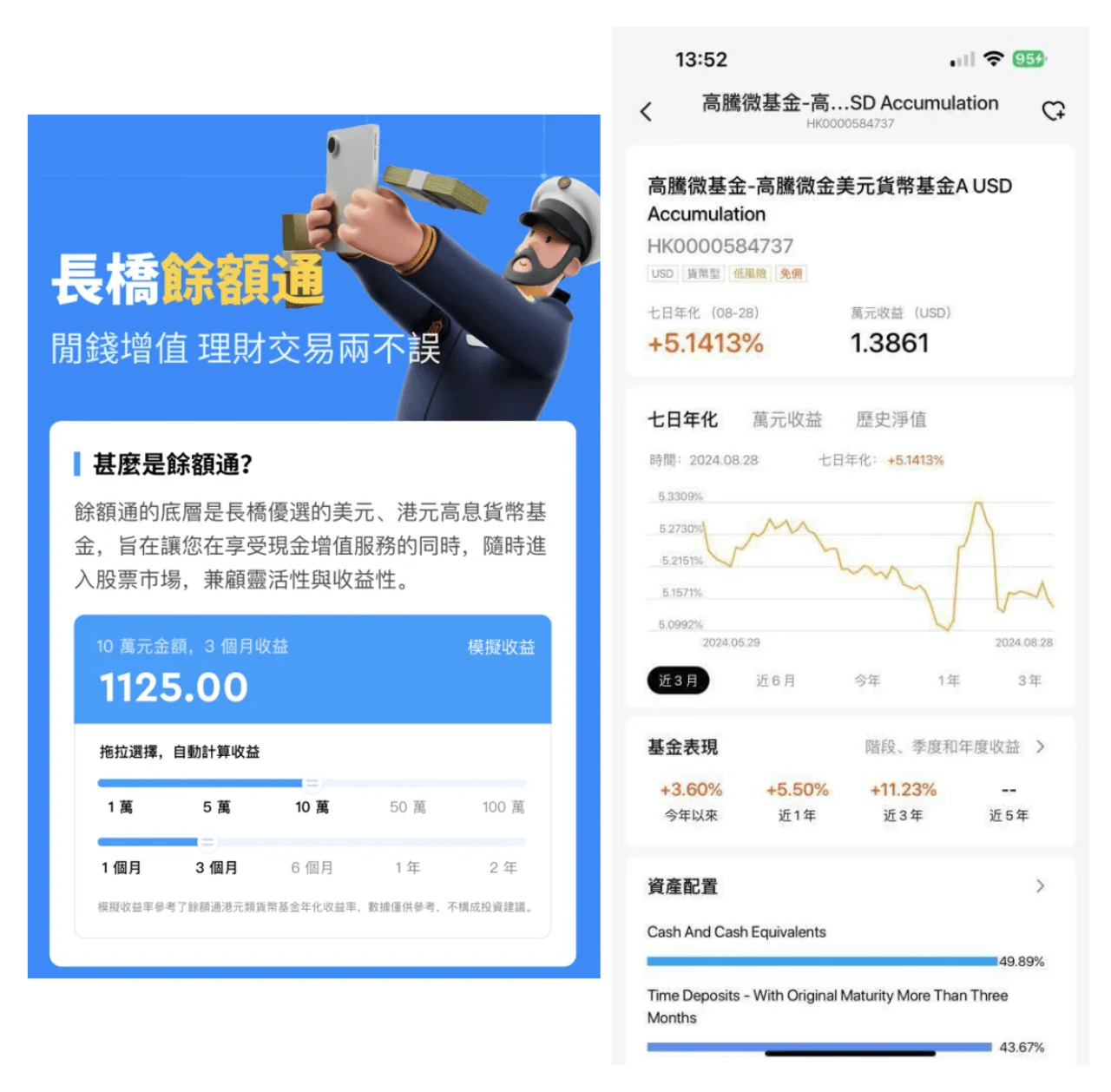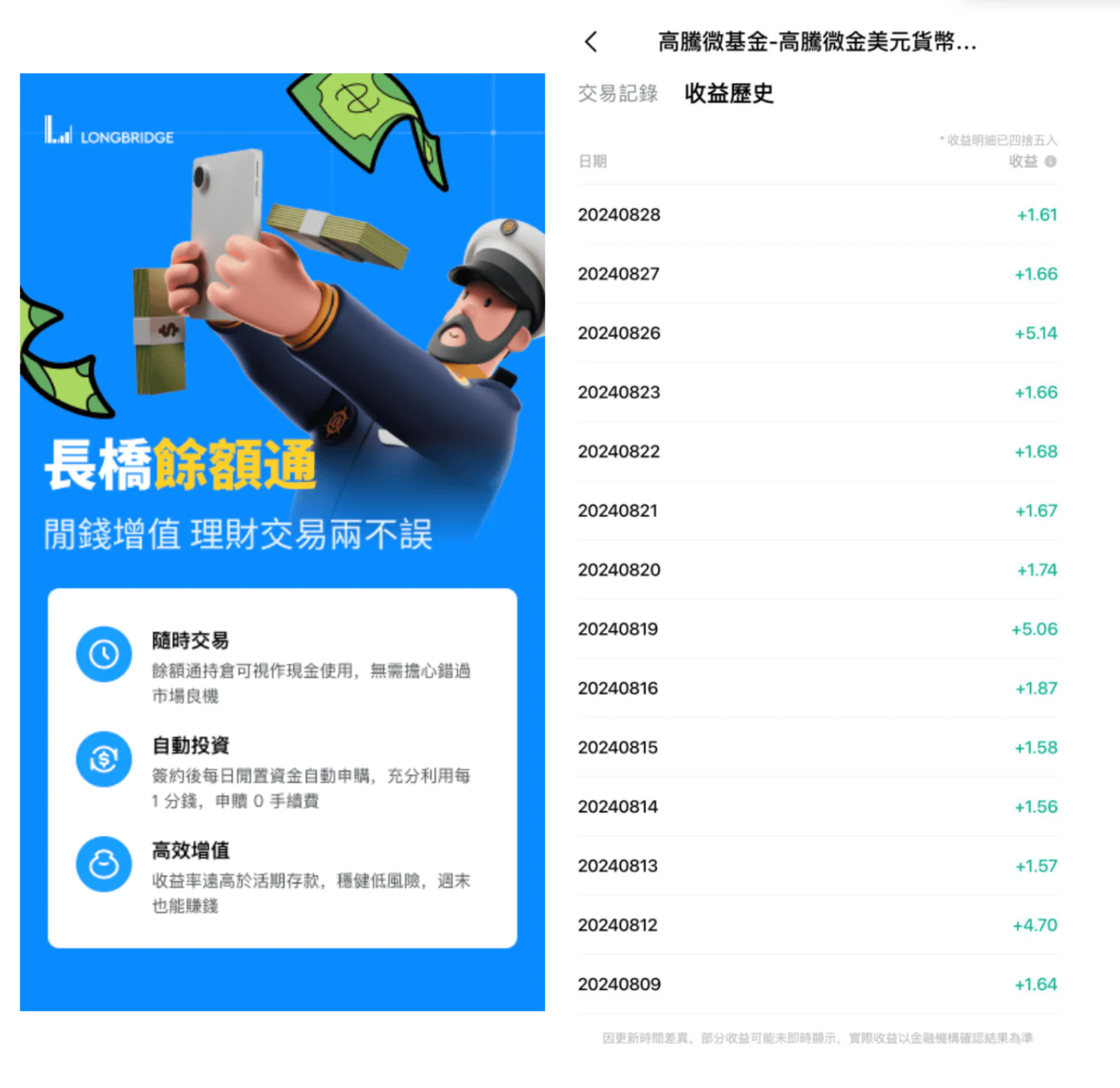 設有「餘額通」功能,一經啟動戶口內的閒置現金會自動買入低風險的貨幣基金賺取高達5%的回報
