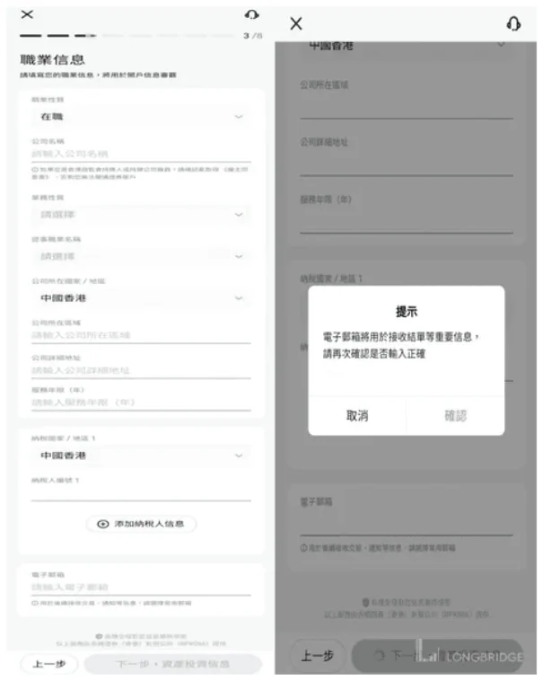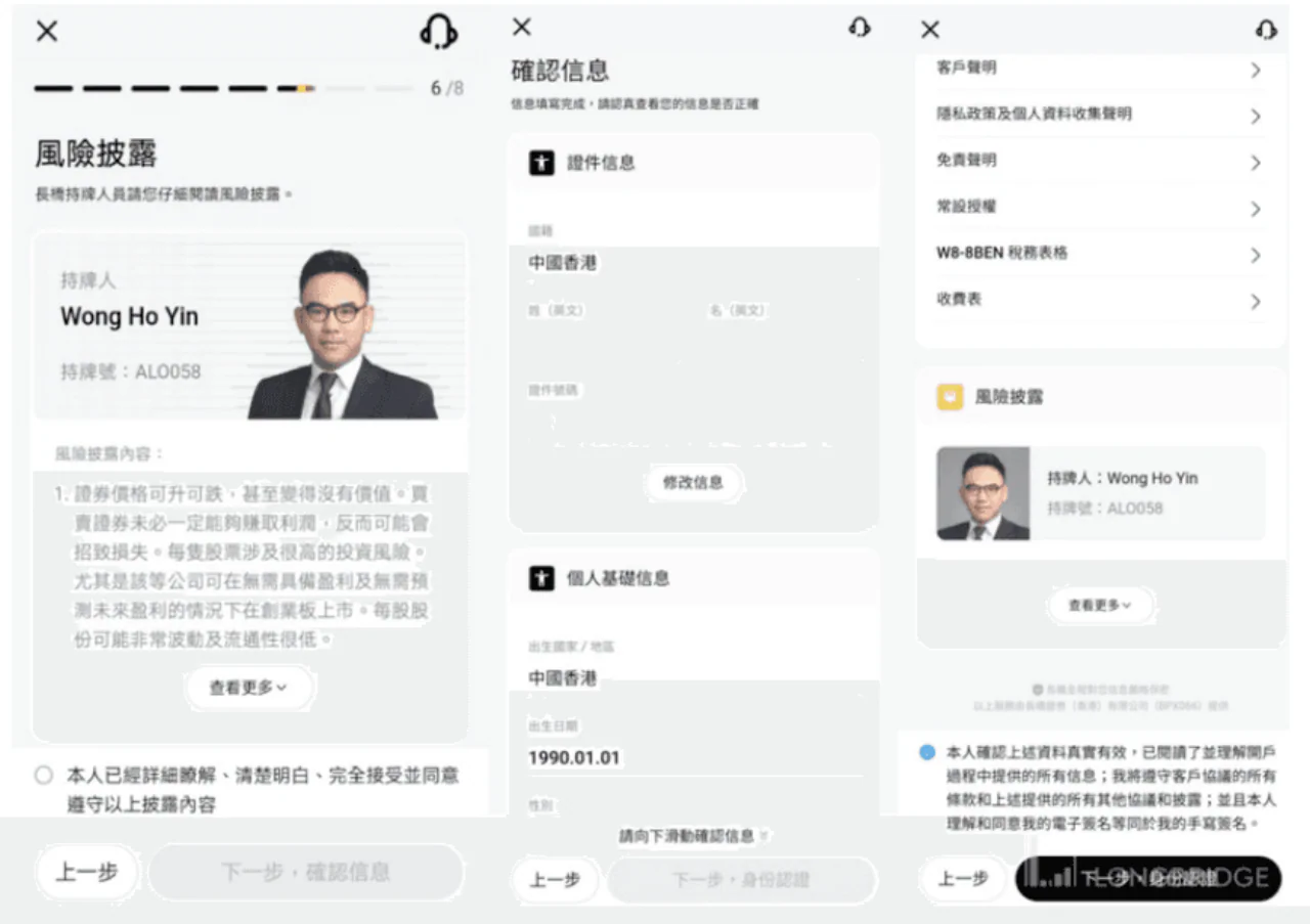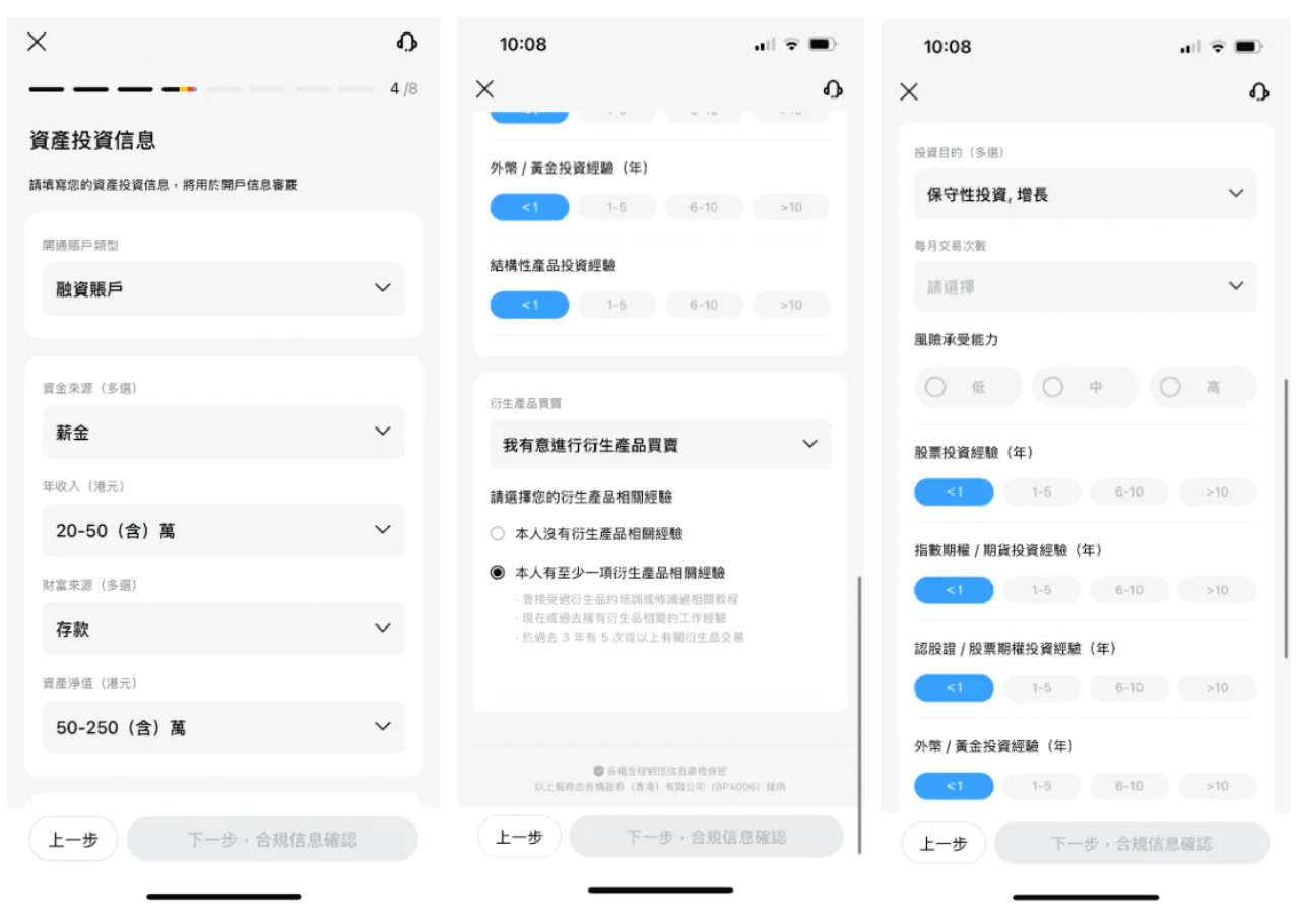 填寫資金來源、年收入、投資目的、風險承受能力、投資經驗等資料,然後申報個人身份,包括是否金融機構相關人士、是否美國公民、是否政治公眾人物等。