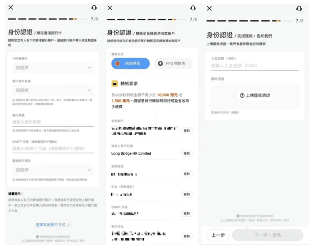 用戶需要綁定同名香港銀行賬戶以進行,填寫銀行賬戶資料後,需轉賬不少於HK$1萬到長橋證券賬戶並上載匯款憑證,最後簽名及提交開戶申請。