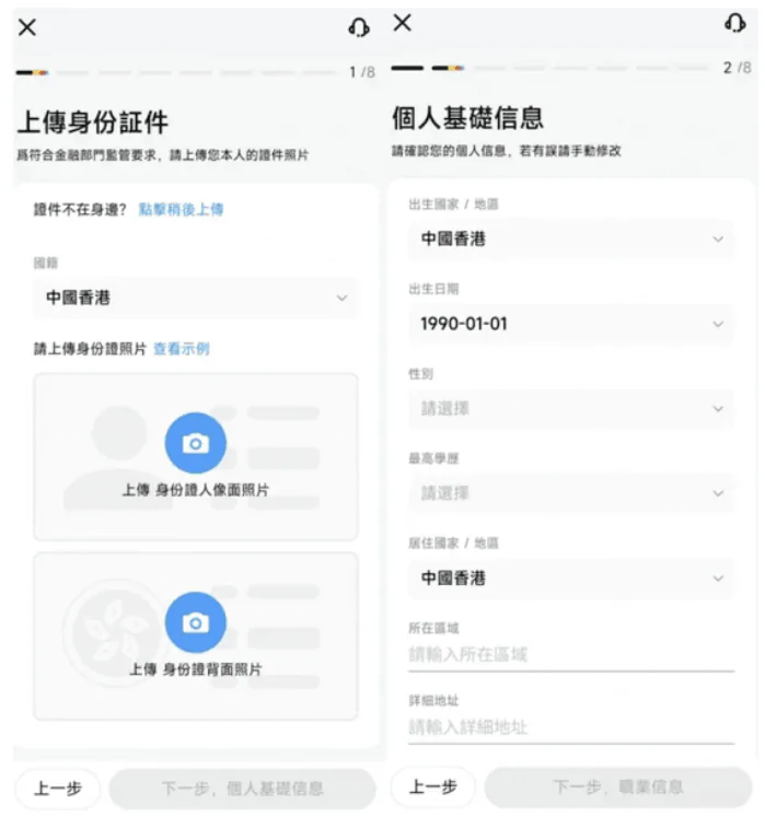 首先需要上載身份證的正面和背面照片,然後填寫個人基本信息,包括出生地區和日期、性別、學歷、居住地址等等,以及上載住址證明。