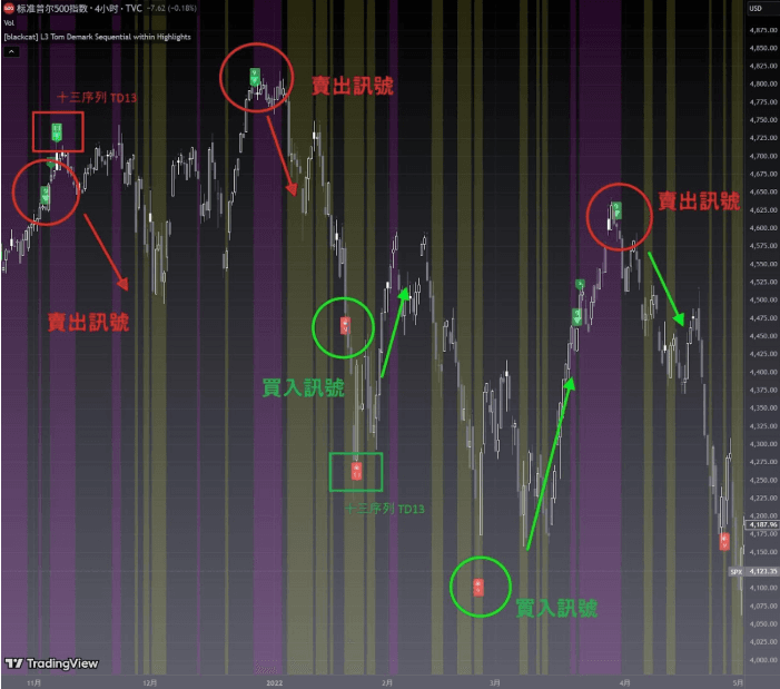 以上是2022年標普500指數的走勢,從上圖可見,當大市連續出現升勢(或跌勢)時,K線圖(陰陽燭)上便會出現「9」這個數字,亦即代表買入或賣出的訊號。例如在2022年初期間,標普500指數連續多日上升,這時K線圖上出現「9」這個數字(高9),代表大市有機會出現反轉。果不其然,標普500其後在高位連日下跌。之後到2月,大市連日下跌後動力開始減弱,K線圖上出現「9」這個數字(低9),代表跌勢很可能會逆轉,而指數亦在2月後開始止跌回穩。