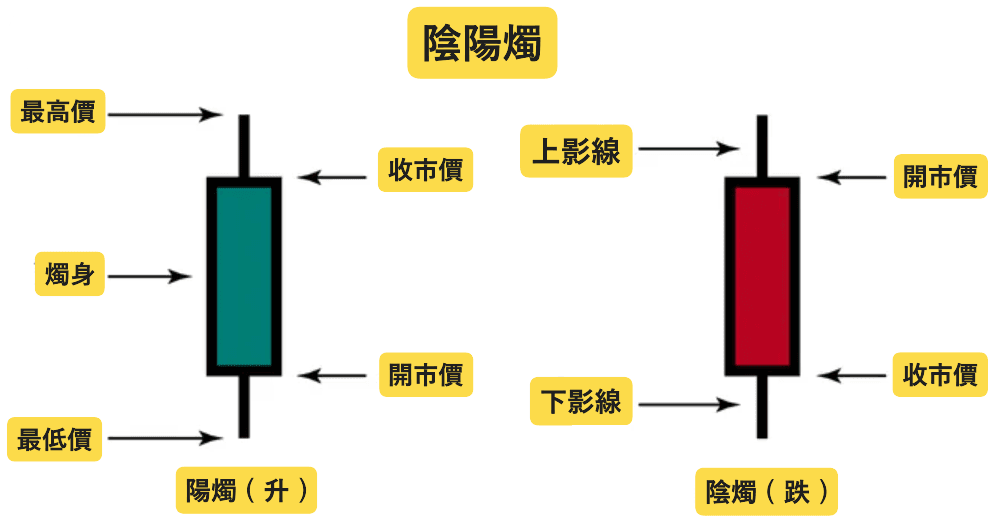 陰陽燭是 K 線圖(蠟燭圖)上的矩形「蠟燭」,用來顯示特定時間內(如一天、一週或一個月)的股價或資產價格波動與走勢。透過陰陽燭,投資者能一目了然掌握價格的即時資訊,而不同的陰陽燭組合形態,在一定程度上亦可反映未來可能的走勢方向。