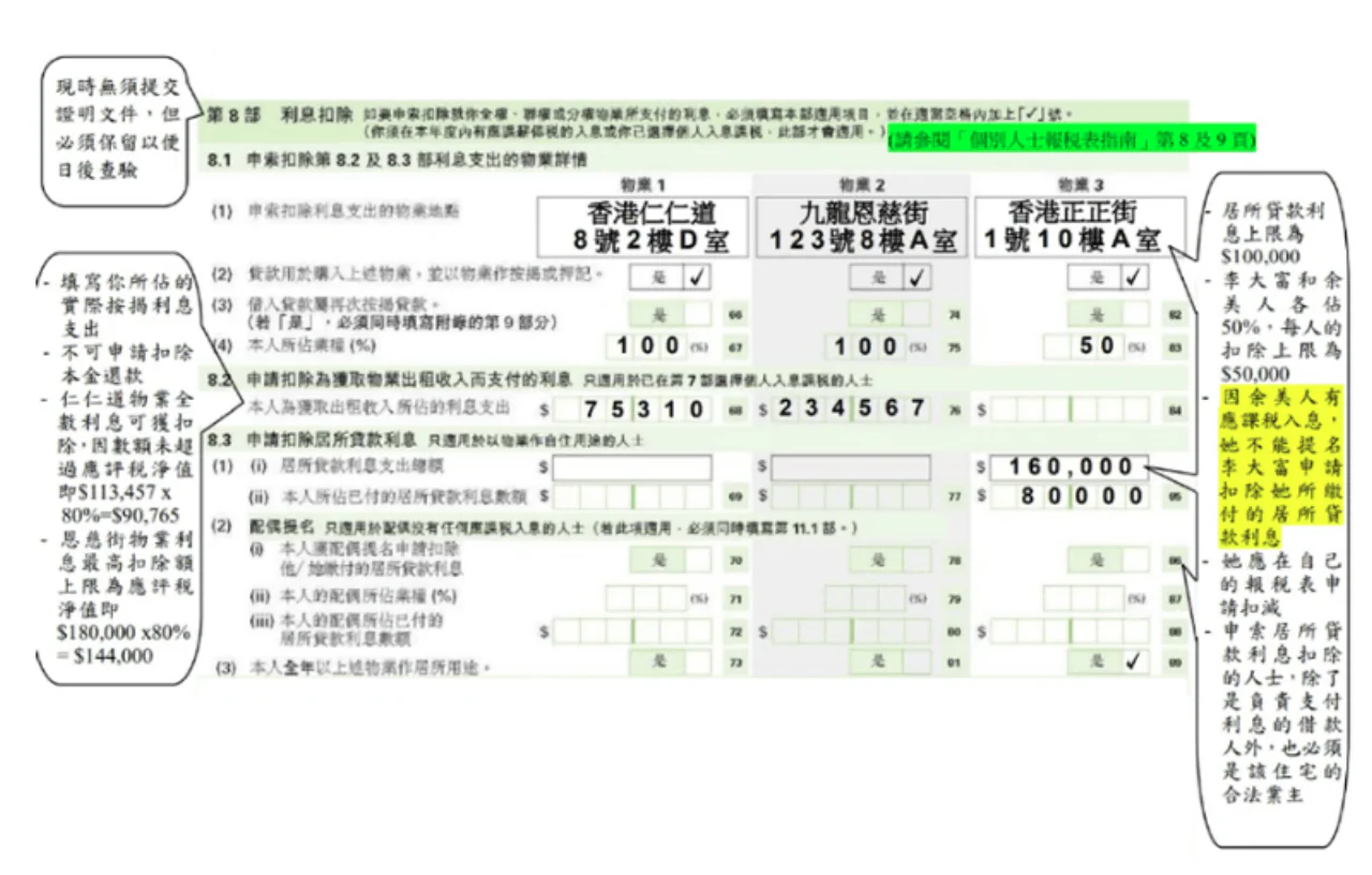 例如夫婦二人聯名擁有物業,即使按揭供款是由其中一人獨力承擔,每人就該單位的供樓利息所得的最高扣稅額為HK$100,000除二,即HK$50,000。