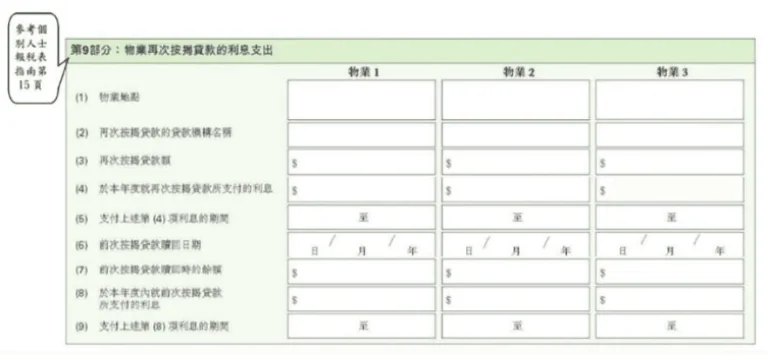 如有關申索涉及物業再次按揭或第二次按揭貸款的利息支出,納稅人謹記填妥附錄的第 9 部分。