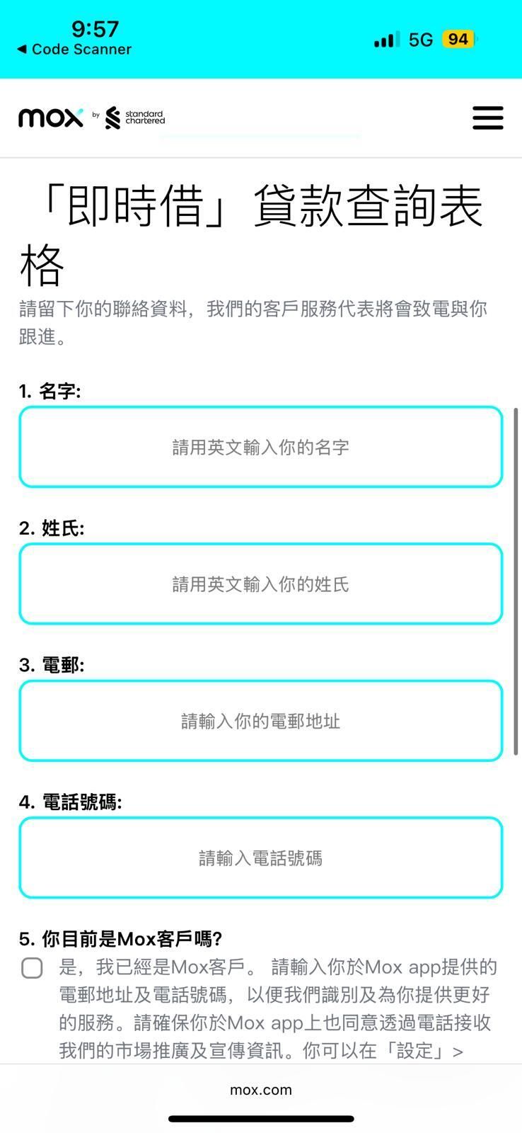- 「即時借」收費將不定時作出更新。受一般條款及細則(請留意附表3之B部:「即時借」)及「即時借」產品資料概要約束。更多詳情請參閱Mox網站內的「條款及細則」頁面。