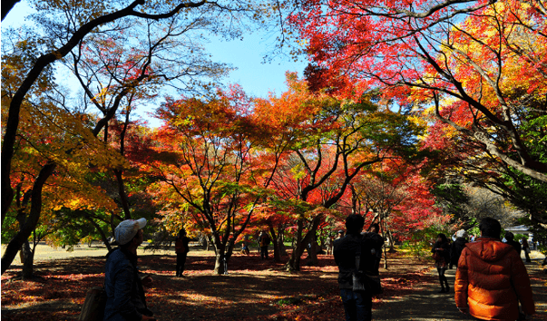 日本紅葉名所新宿御苑位於鬧市之中,是東京第一大庭園。園內分為日式庭園、英式庭園和法式庭園三部分,還有溫室、茶室及人工草坪等設施,不少人會一邊野餐一邊悠閑賞楓。