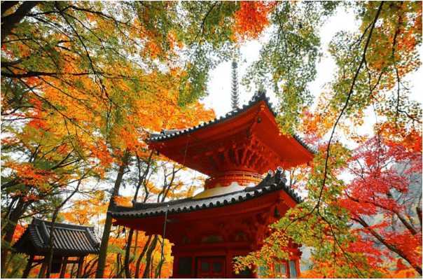 大威德寺早在江戶時代已是當地的賞楓勝地,亦是當地的「府都名勝」。其中,大威德寺的多寶塔是欣賞日本紅葉的最佳位置,莊嚴肅穆的古塔被片片紅葉環繞,展現古雅滄桑之美,每逢賞楓時期,都會吸引一眾攝影愛好者前來拍攝紅葉美景。