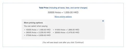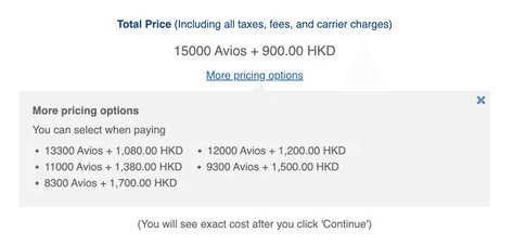 最少Avios: 27,500 Avios + HK$2,839稅項